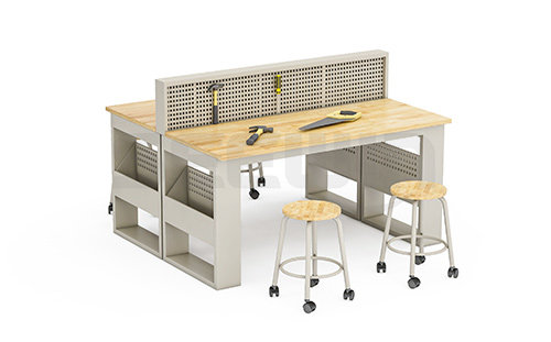 產(chǎn)品臺面采用橡膠木指接板,選材健康安全。桌面及兩側(cè)搭配洞洞板設(shè)計,方便教學(xué)使用。適用于