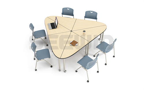 協(xié)作式三角形拼接造型,由三個(gè)右元素和三個(gè)左元素組成。這個(gè)形狀可以讓人們?cè)诮锹淅锝M成小型團(tuán)隊(duì),確保每個(gè)使用者能夠輕松愉悅地參與協(xié)作過(guò)程。桌面可選配翻轉(zhuǎn)式,用于放置電腦,筆記本電腦的電源和數(shù)據(jù)連接都可方便地連接使用。
